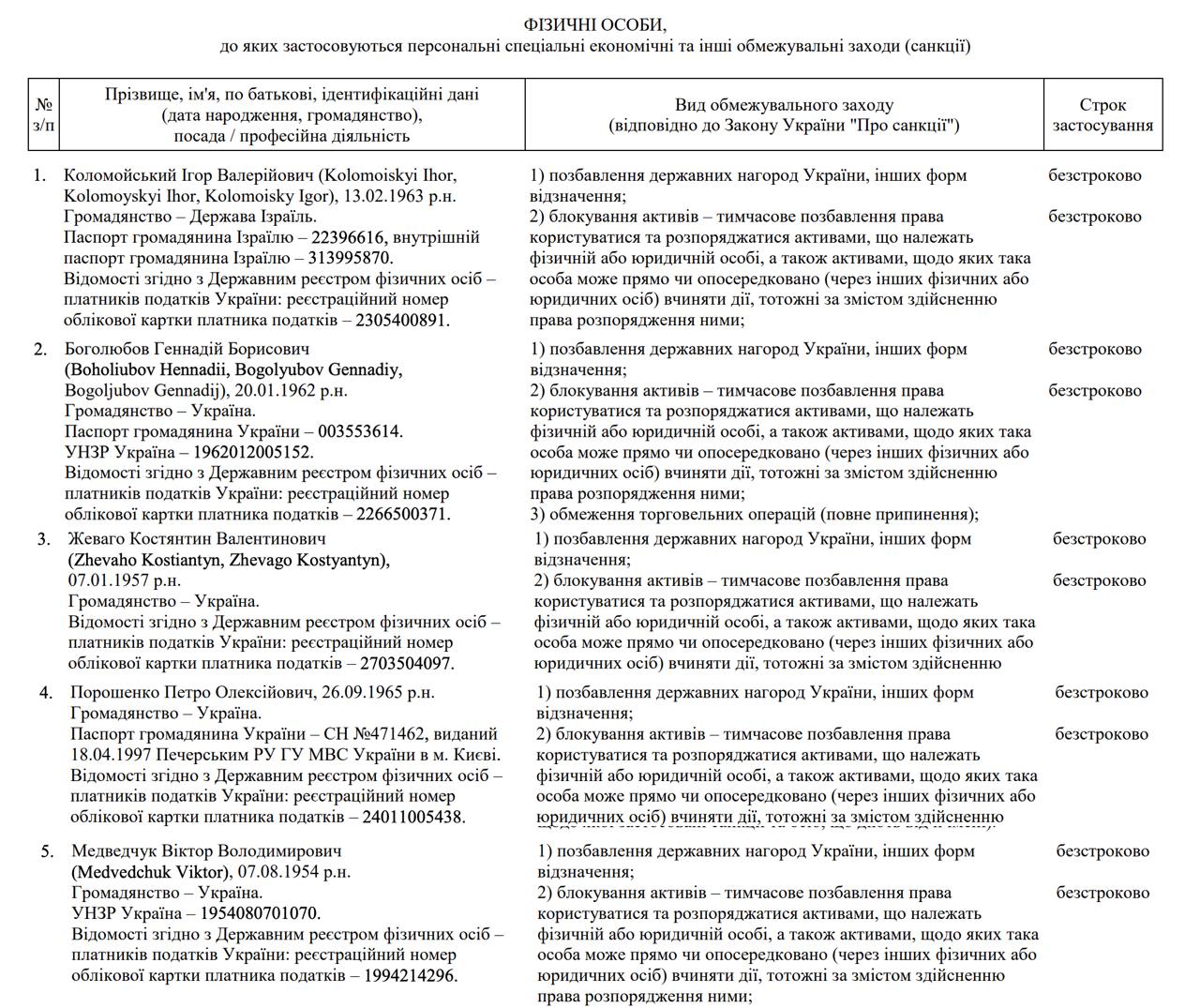 Совет национальной безопасности и обороны Украины (СНБО) вчера ввел санкции не только против бывшего президента Петра Порошенко, но также бизнесменов Игоря Коломойского, Геннадия Боголюбова, Константина Жеваго и экс-нардепа Виктора Медведчука.