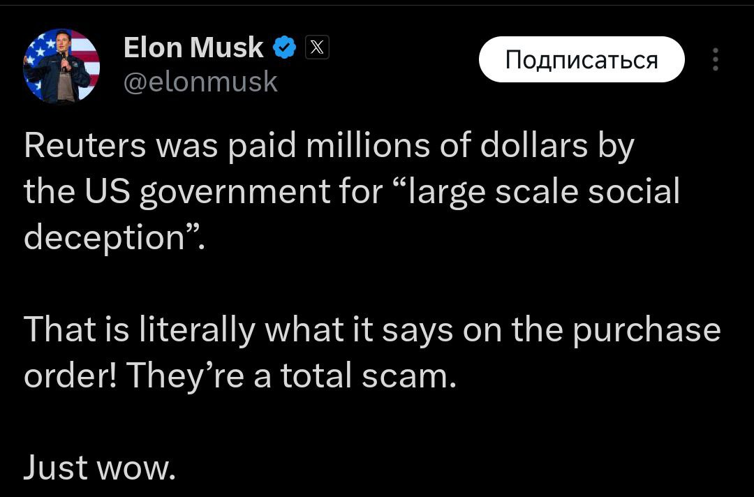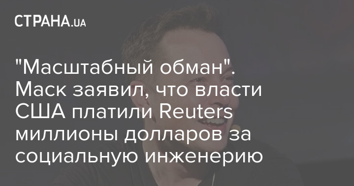 "Правительство США выплатило агентству Reuters миллионы долларов за "масштабный социальный обман". Это буквально то, что написано в заказе на покупку!" - написал Маск.