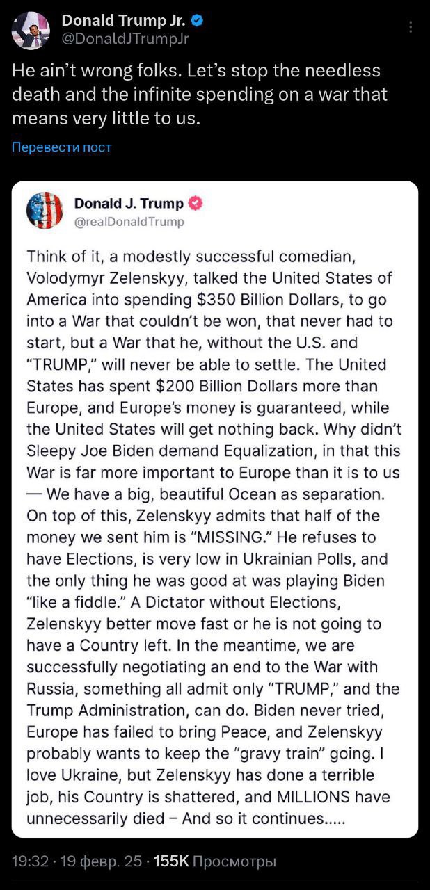 Трамп-младший поддержал заявление отца, в котором глава Белого дома Дональд Трамп назвал президента Украины Владимира Зеленского "диктатором без выборов", и призвал закончить войну в Украине.