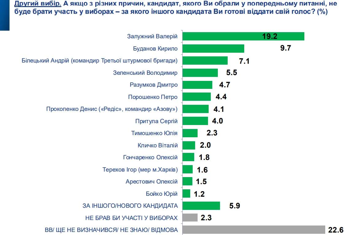 В первом туре выборов президента Украины, если бы они прошли сейчас, победил бы бывший главком ВСУ Валерий Залужный, он получил бы голоса 27,2% опрошенных. 15.9% отдали бы голос за президента Владимира Зеленского.