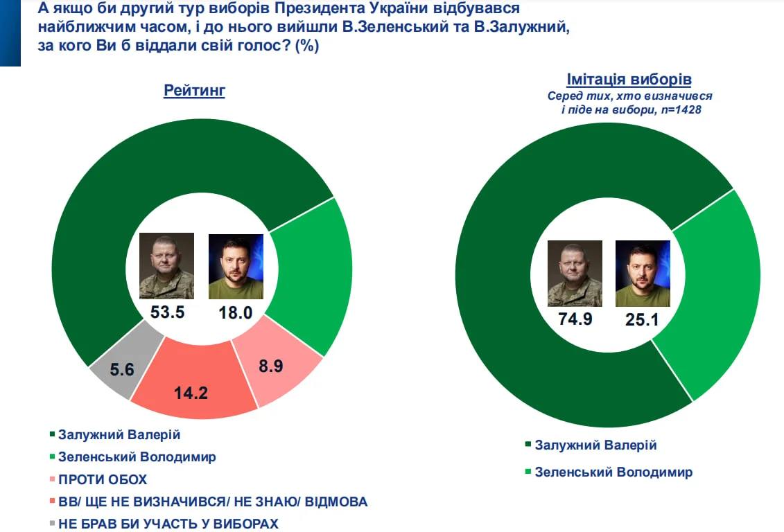 Во втором туре за Залужного проголосовали бы 74.9% опрошенных, а за Зеленского - 25.1%.