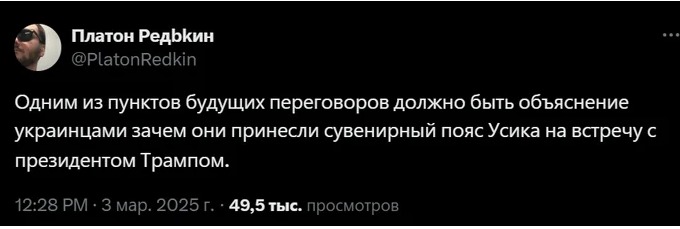"Директор ЦРУ Джон Рэтклифф только что сообщил Марии Бартиромо (журналист Fox News - Ред.), что США приостановили поставки оружия и разведданных в Украину в результате встречи в Овальном кабинете. Рэтклифф говорит, что с нетерпением ждет снятия паузы и работы с Украиной в направлении мира после письма президенту США", - сказано в публикации.