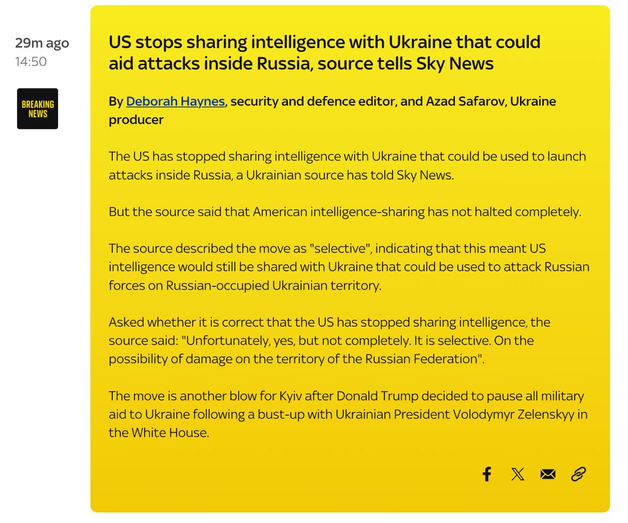 Правда, вскоре украинский источник Sky News уточнил, что США прекратили делиться с Украиной всеми разведданными.