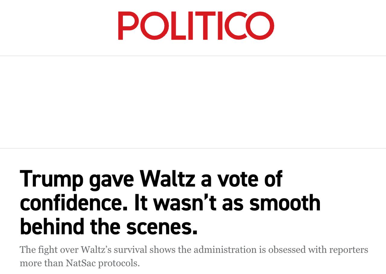 Как пишет Politico, скандал с перепиской в чате обострил отношения Уолтца с ближайшим окружением Трампа и что в администрации очень подозрительно относятся к сотрудникам, которые контактируют с журналистами не их зоны ответственности. У одного сотрудника, которого заподозрили в утечке, даже проверяли телефон на предмет общения с репортером. Также иногда администрация специально распространяла неправдивые слухи, чтобы проверить, кто может их слить.