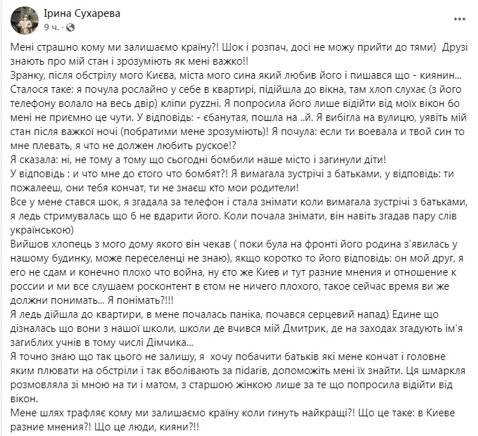 Как с сказано в посте, утром после обстрела Киева она услышала "русское дерьмо" прямо в своей квартире, подошла к окну и увдела, как под домом мальчик смотрит на телефоне музыкальный клип. Сухарева попросила его отойти от ее окон, потому что ей "неприятно это слышать". В ответ ребенок якобы назвал ее @банутой и послал на три буквы. Она выбежала на улицу и сообщила мальчику, что воевала сама, воевал её сын и он погиб. На что, по ее словам, ребенок ответил: "Если ты воевала и твой сын, то мне плевать. Я что, не должен любить русское?"