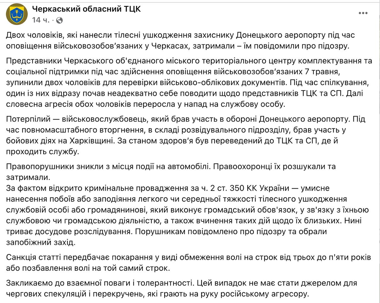 В Черкассах двое мужчин избили сотрудника ТЦК, их задержали. Об этом заявили в пресс-центре Черкасского областного военкомата.