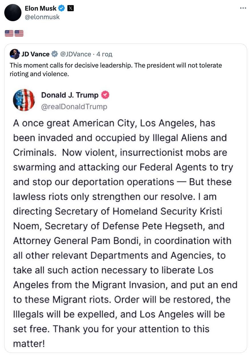 В публикации говорится о том, что президент поручил Национальной гвардии "принять все необходимые меры для освобождения Лос-Анджелеса от нашествия мигрантов и положить конец этим беспорядкам".