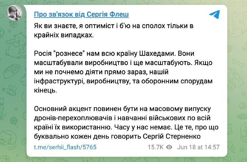 "Как вы знаете, я оптимист и бью тревогу только в крайних случаях. Россия разнесет нам всю страну "Шахедами". Они масштабировали производство и еще масштабируют. Если мы не начнем действовать прямо сейчас, нашей инфраструктуре, производству и оборонным сооружениям конец. Основной акцент должен быть на массовом выпуске дронов-перехватчиков и обучении военных по всей стране их использованию. Времени у нас нет", - считает Бескрестнов.