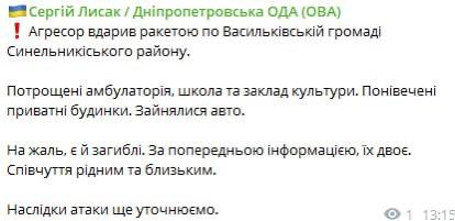 13:25 В результате удара по Синельниковскому району Днепропетровской области есть погибшие, сообщает ОВА.