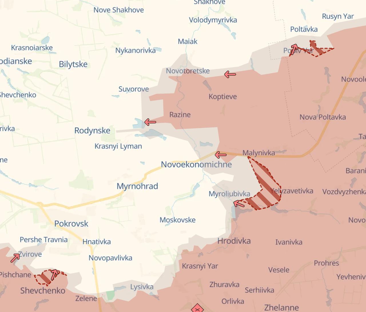 07:53 Россияне продвинулись к югу от Константиновки и к востоку от Мирнограда, сообщает военный паблик Deep State.