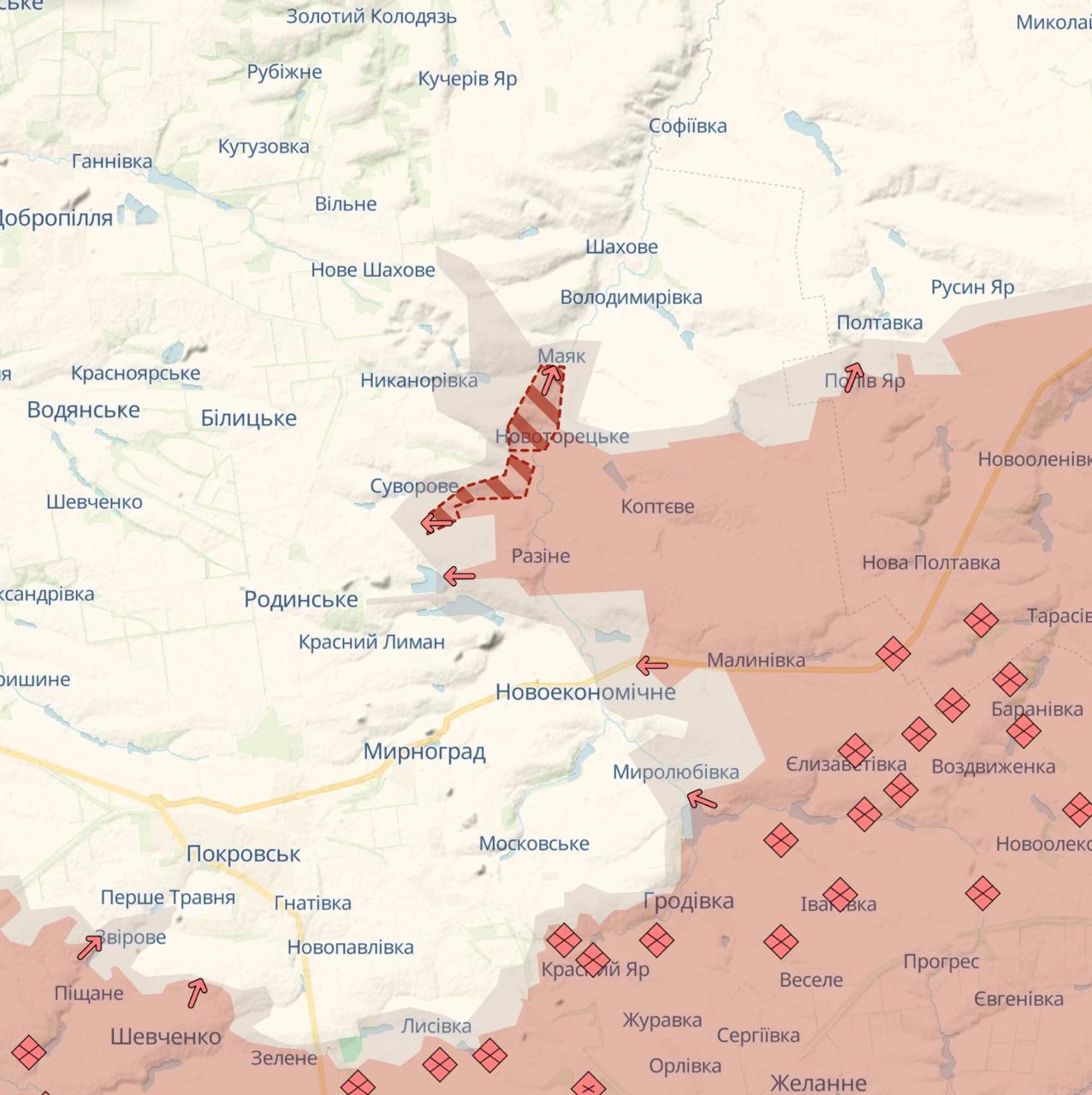 Также россияне развивают наступление севернее Мирнограда и пошли в новом направлении - на север через Маяк.