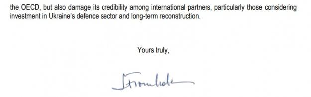 "Если (вопрос, возникший из-за принятия закона - Ред.) останется нерешенным – это не только поставит под угрозу перспективы присоединения Украины к Конвенции ОЭСР о борьбе со взяточничеством, а также ее усилия по вступлению в ОЭСР, но и подорвет ее авторитет среди международных партнеров, в частности тех, которые рассматривают возможность инвестирования в оборонный сектор Украины и ее долгосрочное восстановление", – говорится в письме, который вчера отправила замглавы Офиса Президента Ирине Мудрой глава антикоррупционного отдела ОЭСР Джулия Фромгольц.
