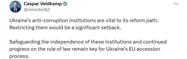 Тем временем нидерландский министр иностранных дел Каспар Вельдкамп заявил, что подобные действия также ставят под угрозу перспективу вступления Украины в Европейский Союз.