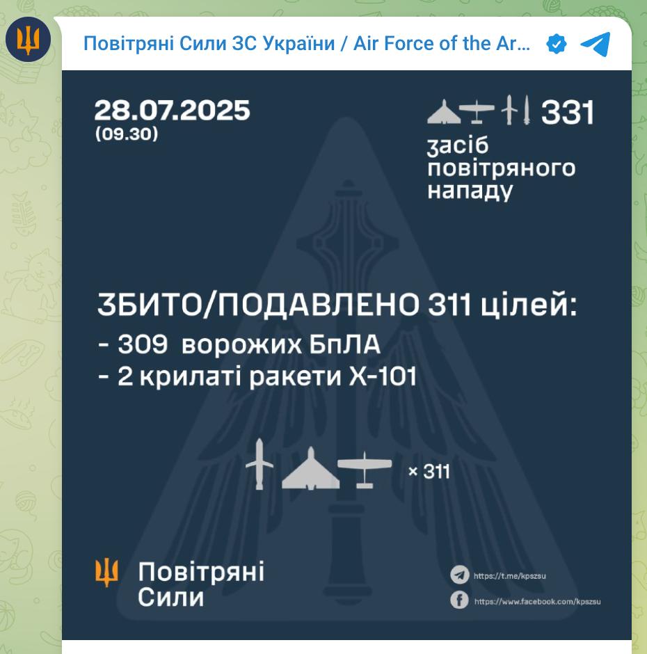 Сбить\подавить удалось 309 дронов (Шахеды и имитаторы) из 324, две ракеты Х-101 из четырех. Не удалось сбить все 3 "Кинжала", но заявлено, что они "не достигли целей".