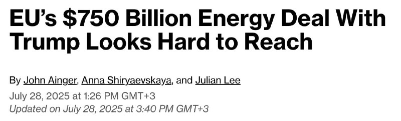 Так, агентство Bloomberg утверждает, что обещание Евросоюза закупить у США энергоносителей на 750 млрд долларов в течение трех лет выглядит практически нереальным.