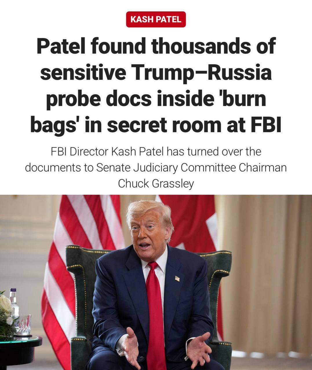 Директор Федерального бюро расследований (ФБР) Кеш Патель обнаружил десятки секретных документов о том, как фабриковалось дело о "связях" президента США Дональда Трампа с РФ в специальной комнате, где осуществляется сжигание конфиденциальных материалов.