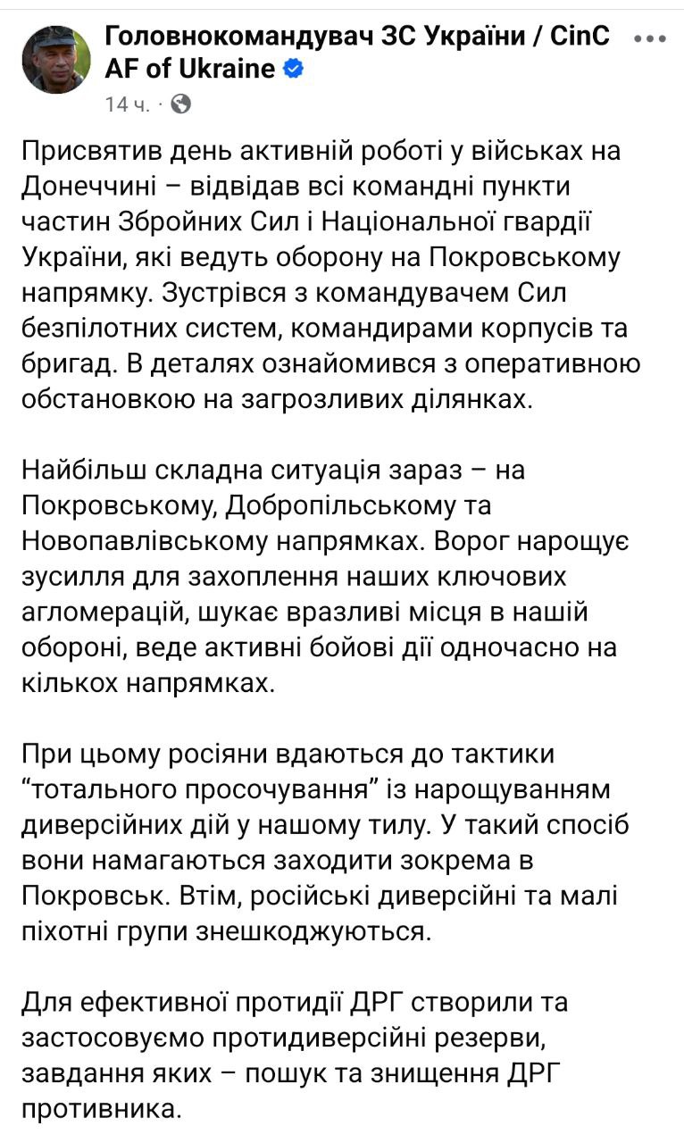 12:19 Главком ВСУ Сырский после поездки на фронт сообщил, что "наиболее сложная обстановка" сейчас на Покровском, Добропольском и Новопавловском направлениях.