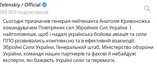 "Сегодня назначил генерал-лейтенанта Анатолия Кривоножко командующим Воздушных сил ВСУ", - написал Зеленский.