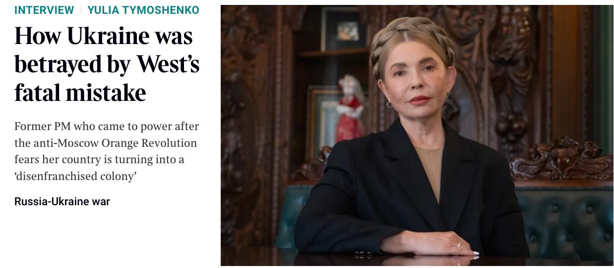 "С начала полномасштабного вторжения России западные страны - под угрозой приостановки предоставления кредитов - навязали неприемлемый контроль над государственными институтами Украины, государственными банками и монополиями, подрывая суверенитет страны. Это жестоко и несправедливо по отношению к нации, находящейся в состоянии войны", - сказала Тимошенко.