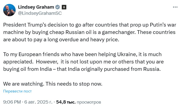 "Решение президента Трампа атаковать страны, которые поддерживают военную машину Путина, покупая дешёвую российскую нефть, меняет правила игры. Этим странам предстоит заплатить давно назревшую и высокую цену. Мои европейские друзья, которые помогают Украине, очень признательны. Однако ни я, ни другие не упускают из виду, что вы покупаете нефть в Индии, которую Индия изначально покупала у России. Мы наблюдаем. Это нужно прекратить немедленно", – заявил сенатор.