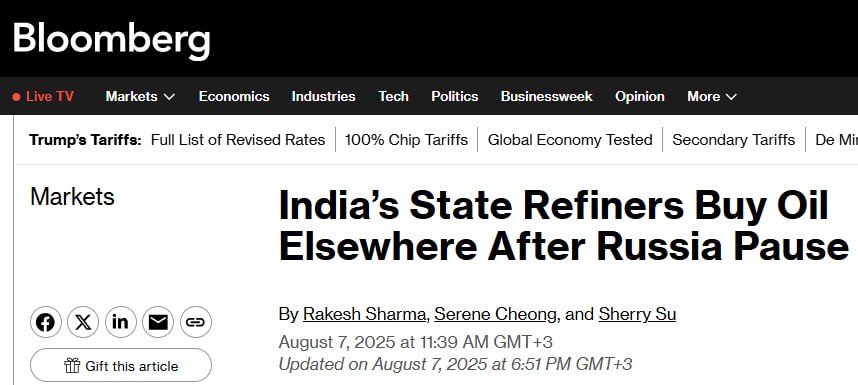 Напомним, на днях в Bloomberg уже писали, что в Индии не давали указаний нефтеперерабатывающим заводам страны отказаться от российской нефти.