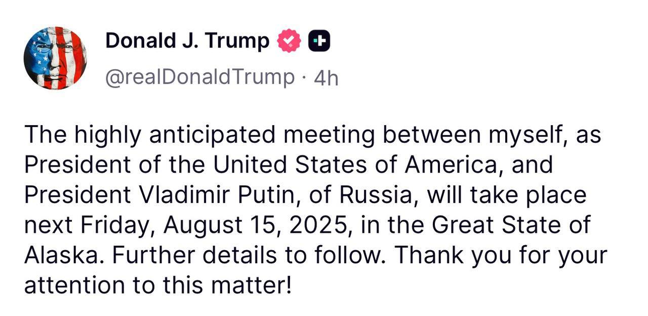 "Долгожданная встреча между мной, президентом США, и президентом России Владимиром Путиным состоится в пятницу, 15 августа 2025 года, в великом штате Аляска. Дополнительная информация будет представлена позже", - написал Трамп.