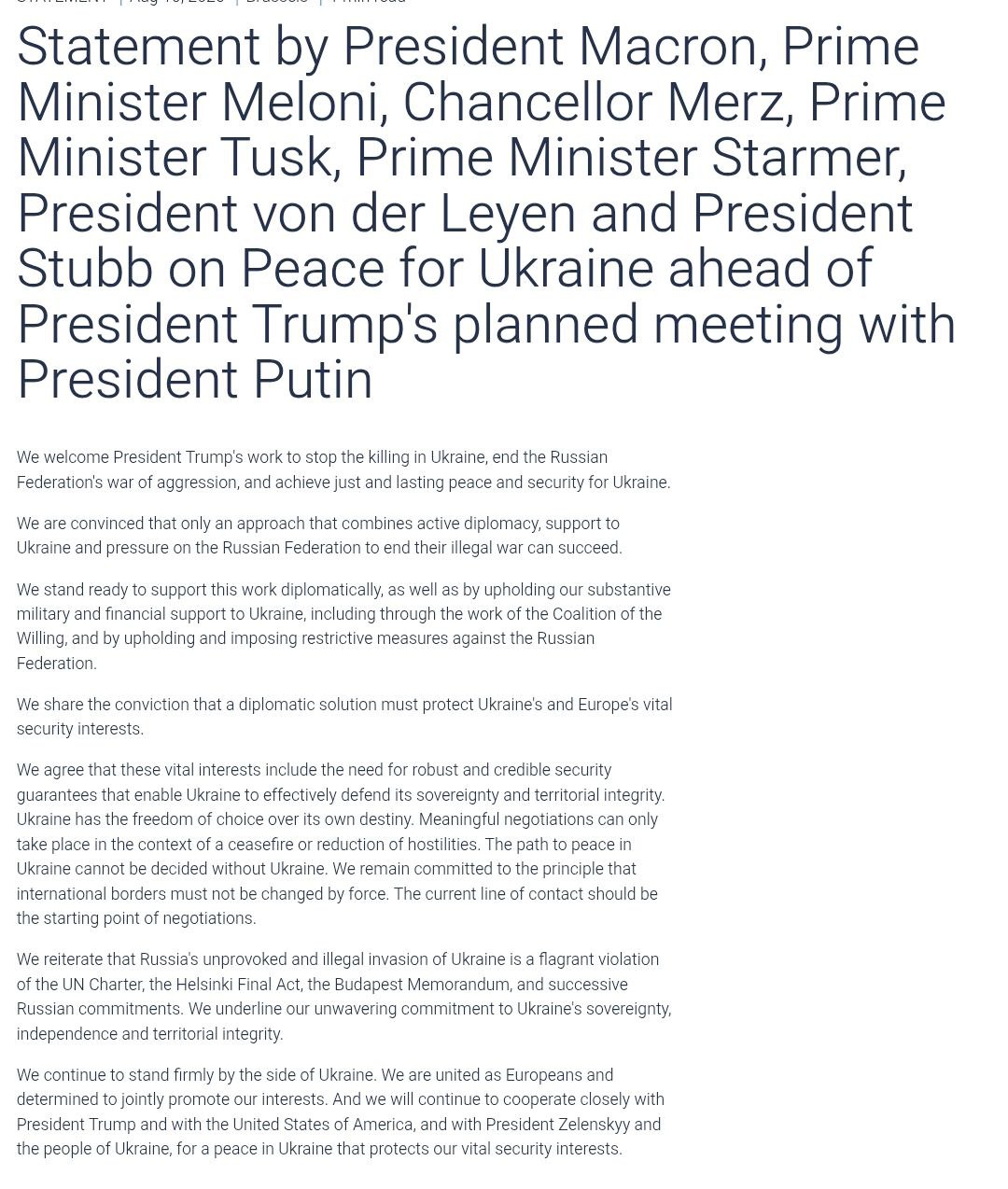 06:53 Лидеры Франции, Италии, Германии, Польши, Великобритании и Финляндии, а также Еврокомиссии сделали официальное заявление накануне переговоров Путина и Трампа.