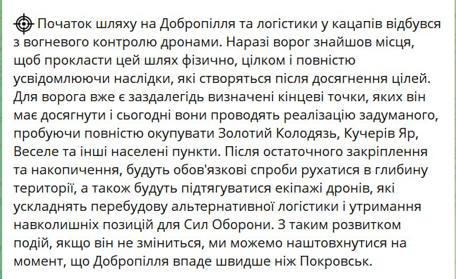 "С таким развитием событий, если они не изменятся, мы можем столкнуться с тем, что Доброполье падет быстрее Покровска", – констатирует DS.