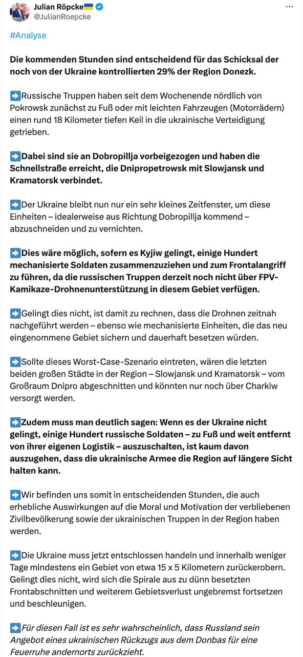 Такое мнение высказал в своем аккаунте в Х военный обозреватель немецкого таблоида Bild Юлиан Репке.