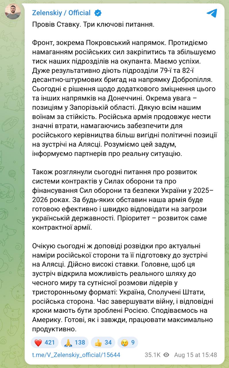 Сегодня он также ожидает доклад украинской разведки "об актуальных намерениях российской стороны и ее подготовке к встрече на Аляске". Зеленский соглашается с Дональдом Трапом и Кириллом Дмитриевым в том, что "ставки высоки". ("Высокие ставки!" - эту фразу Трамп написал в своей соцсети накануне встречи с Владимиром Путиным, а Дмитриев прокомментировал пост одним словом: "Правда".)