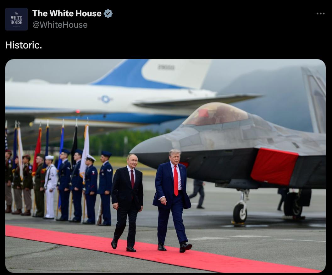 09:44 Самолёт Путина, когда он улетал с Аляски, сопровождали американские военные самолёты F-22.