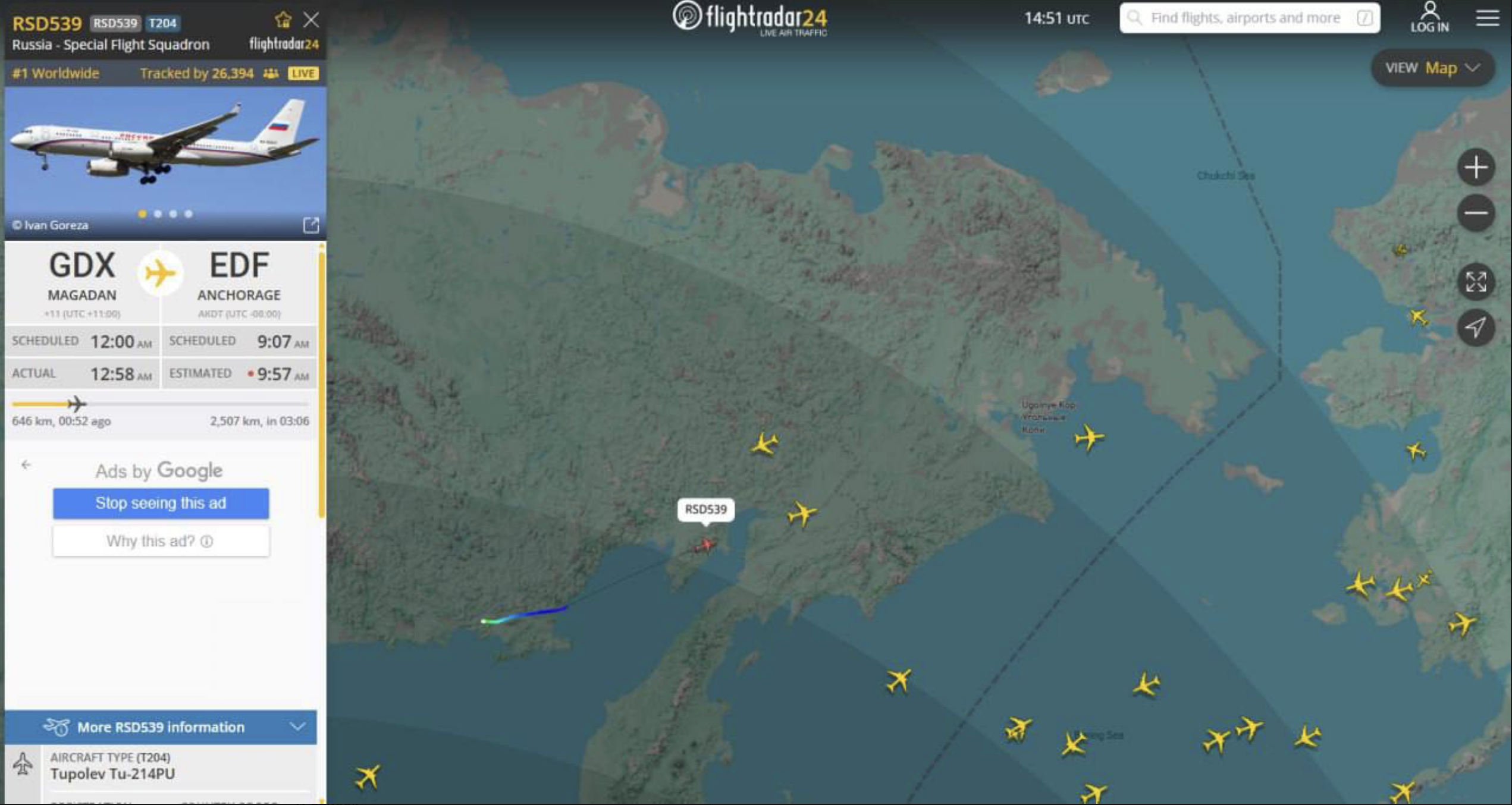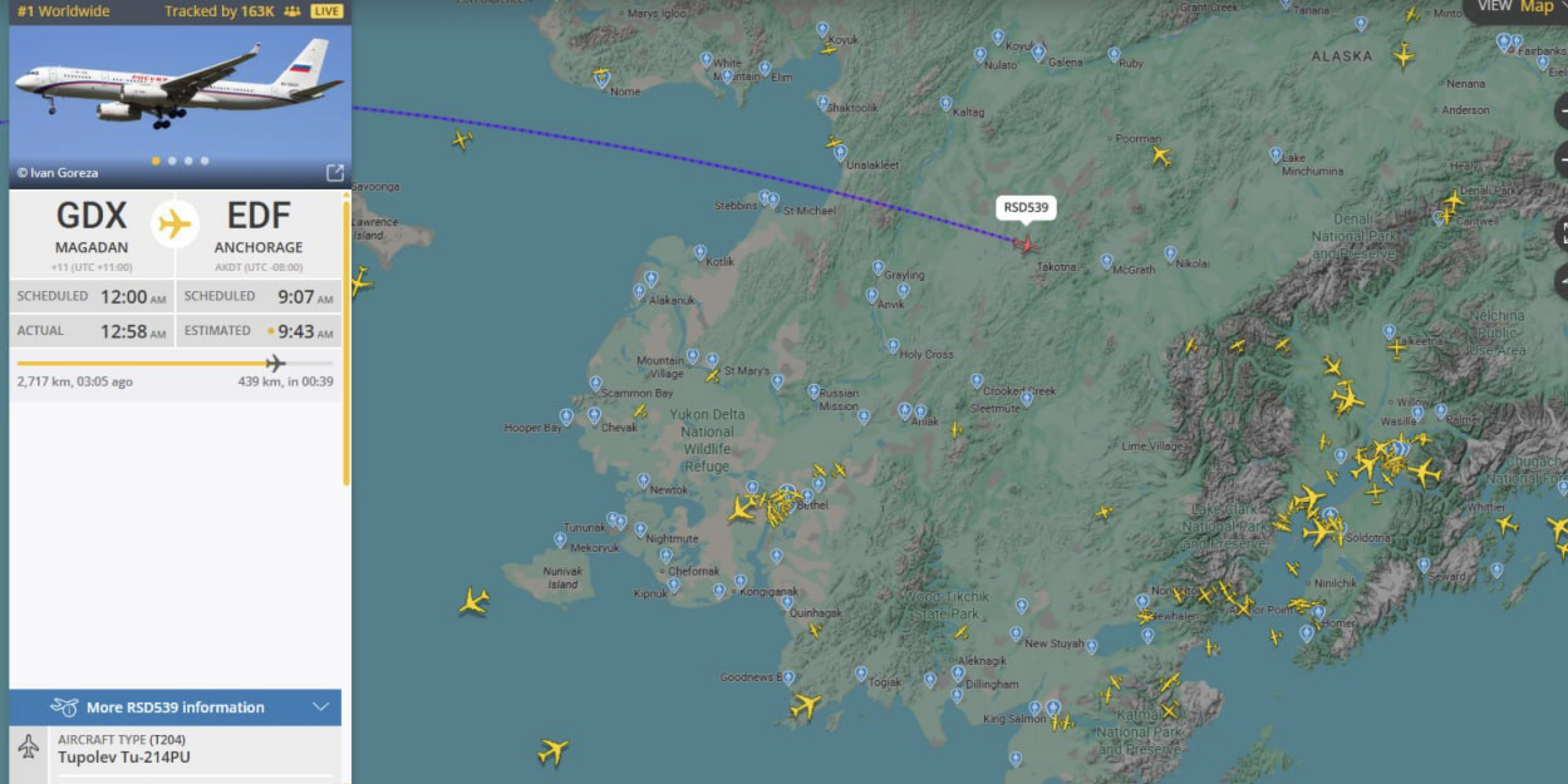 19:22 Ту-214ПУ с Путиным на борту вошёл в воздушное пространство США, следует из данных Flight Radar24.