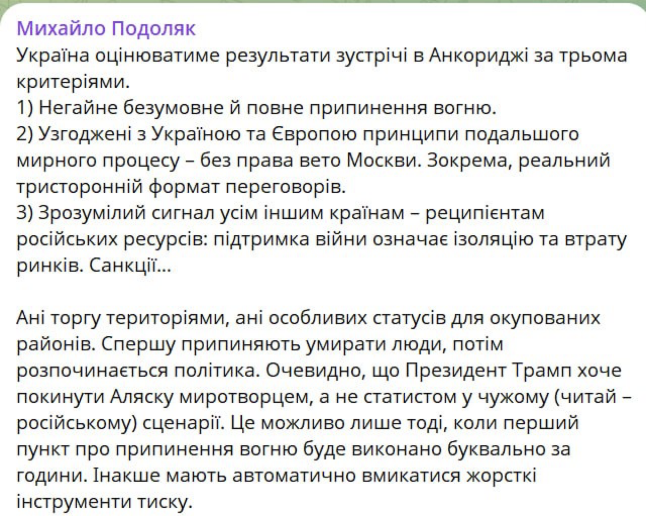 19:12 Советник главы Офиса президента Михаил Подоляк сообщил, по каким критериям Украина "будет оценивать результаты встречи в Анкоридже":