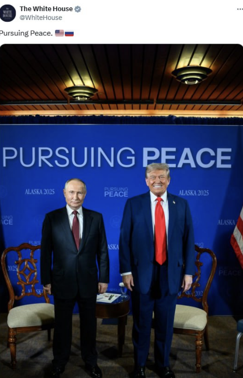 "Улыбающийся Владимир Путин выглядывал из окна бронированного лимузина президента Дональда Трампа, когда они проезжали мимо ряда камер у взлётно-посадочной полосы на Аляске", - добавляет канал.