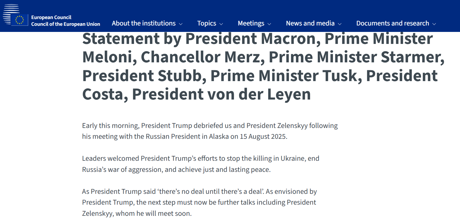 Издание Politico со ссылкой на двух дипломатов ЕС сообщает, что сегодня созывается срочная встреча послов всех 27 стран-членов ЕС для обсуждения дальнейших шагов блока после того как Трамп изложил европейцам и президенту Украину Владимиру Зеленскому итоги переговоров с Путиным.