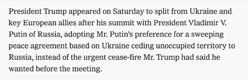 Отметим, что информация The New York Times подтверждает анализ "Страны" о том, что Трамп и Путин на Аляске могли согласовать большинство ключевых параметров мирного урегулирования, и теперь Трамп предлагает Зеленскому принять их.