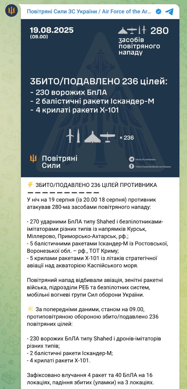 09:25 В ночь переговоров Зеленского и Трампа Россия запустила по Украине 270 "Шахедов" и 10 ракет. Сбить удалось 230 БПЛА и 6 ракет ("Искандеры" и Х-101).