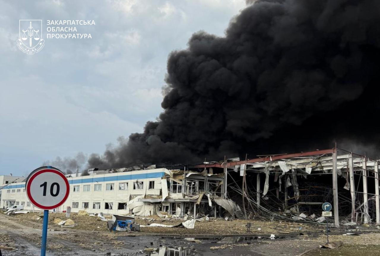 В Мукачево удар по заводу электроники Flex вызвал масштабное возгорание. ОВА сообщает об уничтожении складов и 12 пострадавших. Городские паблики призывают жителей закрывать окна из-за масштабного пожара (первые три фото и видео).