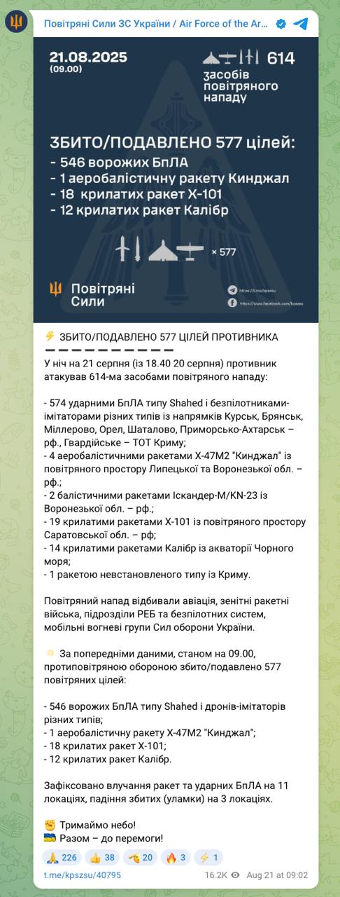 По данным мониторинговых групп, в воздухе находились до пяти стратегических бомбардировщиков Ту-95/160 и четырех истребителей МиГ. Россия применила дроны-камикадзе, а также ракеты "Циркон", "Калибр", "Кинжал" и Х-101.