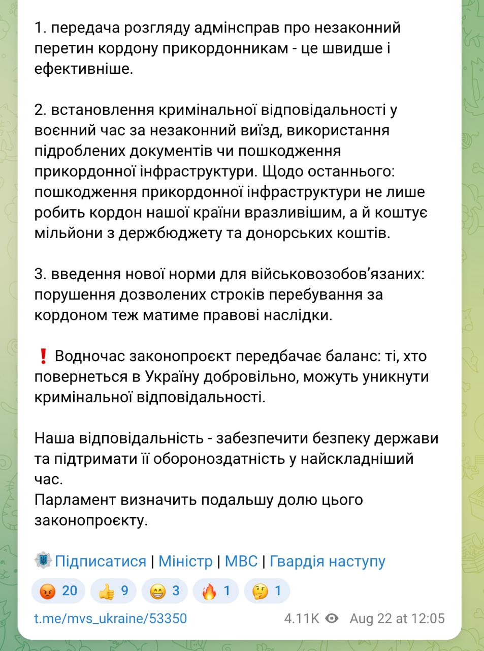 12:51 МВД сообщает, что это оно разработало законопроект об уголовной ответственности за незаконный выезд за границу, внесенный в Раду премьером Свириденко.
