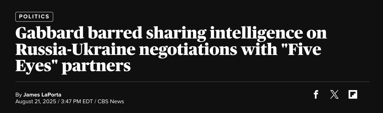 Директор национальной разведки Тулси Габбард 20 июля издала директиву для разведчиков, предписывающую, чтобы вся информация о российско-украинских переговорах не передавалась партнерам США.