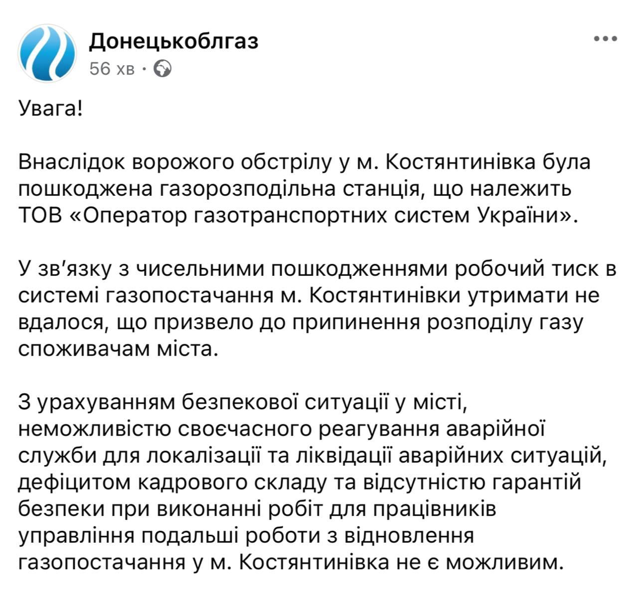 12:28 Прифронтовая Константиновка после обстрела осталась без газа, сообщает Донецкоблгаз.