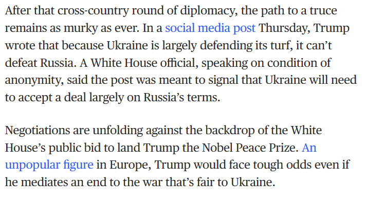 13:54 Ещё одно американское издание пишет, что недавний пост Трампа о том, что Украина, не атакуя Россию, победить в войне не может, является сигналом о том, что Украине придётся принять соглашение, в основном, на условиях России.