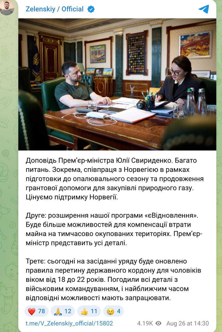 14.35 Украинским мужчинам младше 22 лет могут разрешить выезд за границу уже сегодня, сообщил Зеленский по итогам встречи с премьером Свириденко.