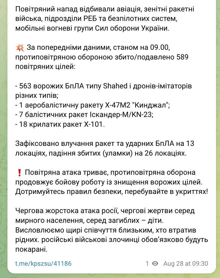 09:35 Украину ночью атаковали 598 БПЛА, включая "Шахеды", и 31 ракета. Были прилеты в 13 локациях.