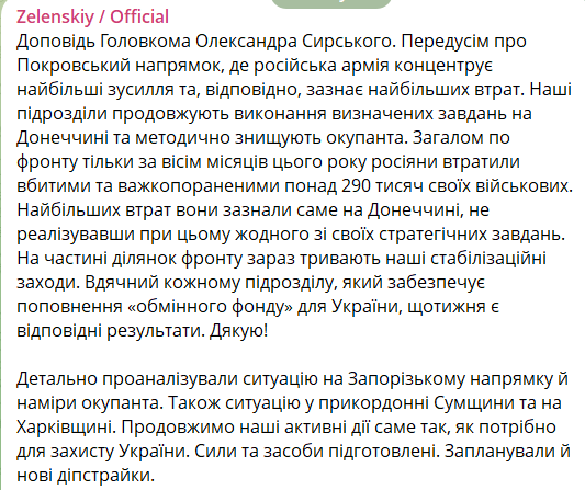 Об этом Зеленский сообщил в своем телеграм-канале по итогам совещания с главкомом ВСУ Александром Сырским.
