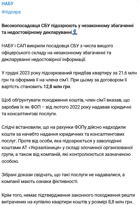 По данным следствия, в декабре 2023 года подозреваемый купил квартиру за 21,6 млн грн и оформил ее на члена семьи. По договору ее стоимость составляет 12,8 млн грн.