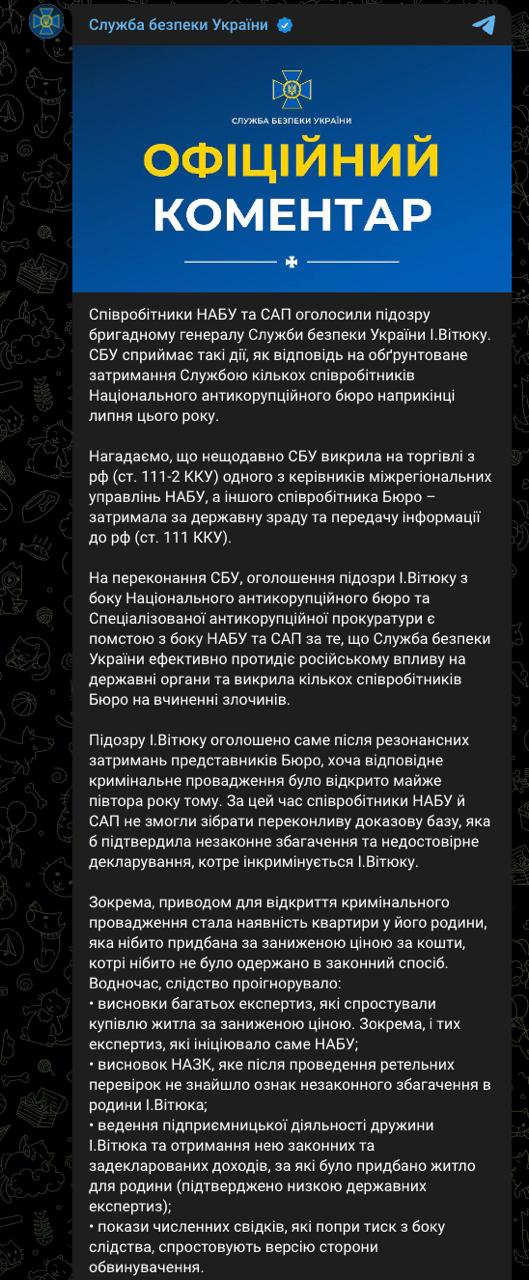 Поводом для расследования стала квартира семьи генерала, купленная якобы по заниженной цене. Однако в СБУ заявили, что следствие проигнорировало "выводы многочисленных экспертиз, которые опровергли версию о покупке жилья по заниженной цене", а также "вывод НАЗК, которое не нашло признаков незаконного обогащения в семье Витюка".