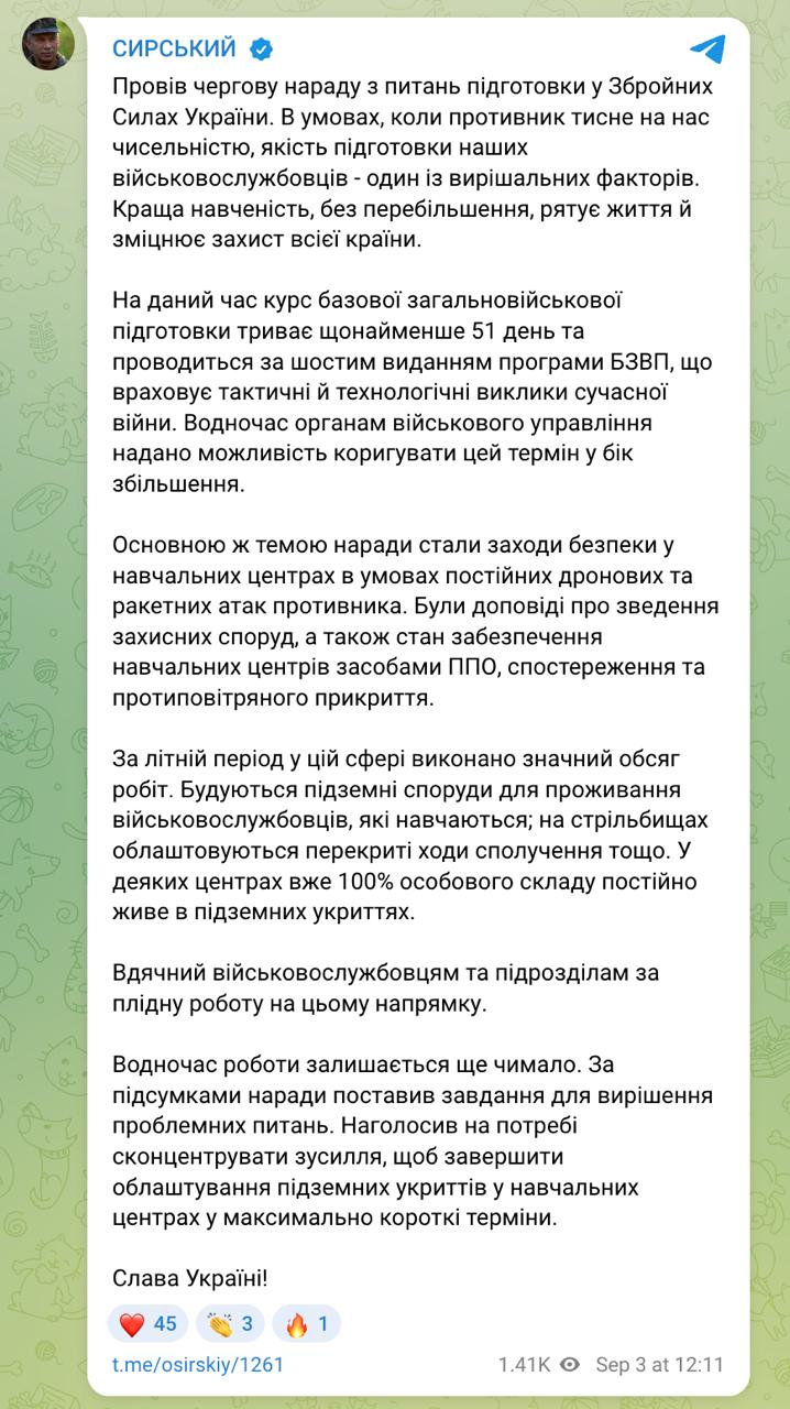 "За летний период в данной сфере выполнен значимый размер работ. Строятся подземные сооружения для проживания учащихся военнослужащих; на стрельбищах обустраиваются перекрытые ходы сообщения и т.д. В некоторых центрах уже 100% личного состава постоянно живет в подземных укрытиях", - заявил главком ВСУ.