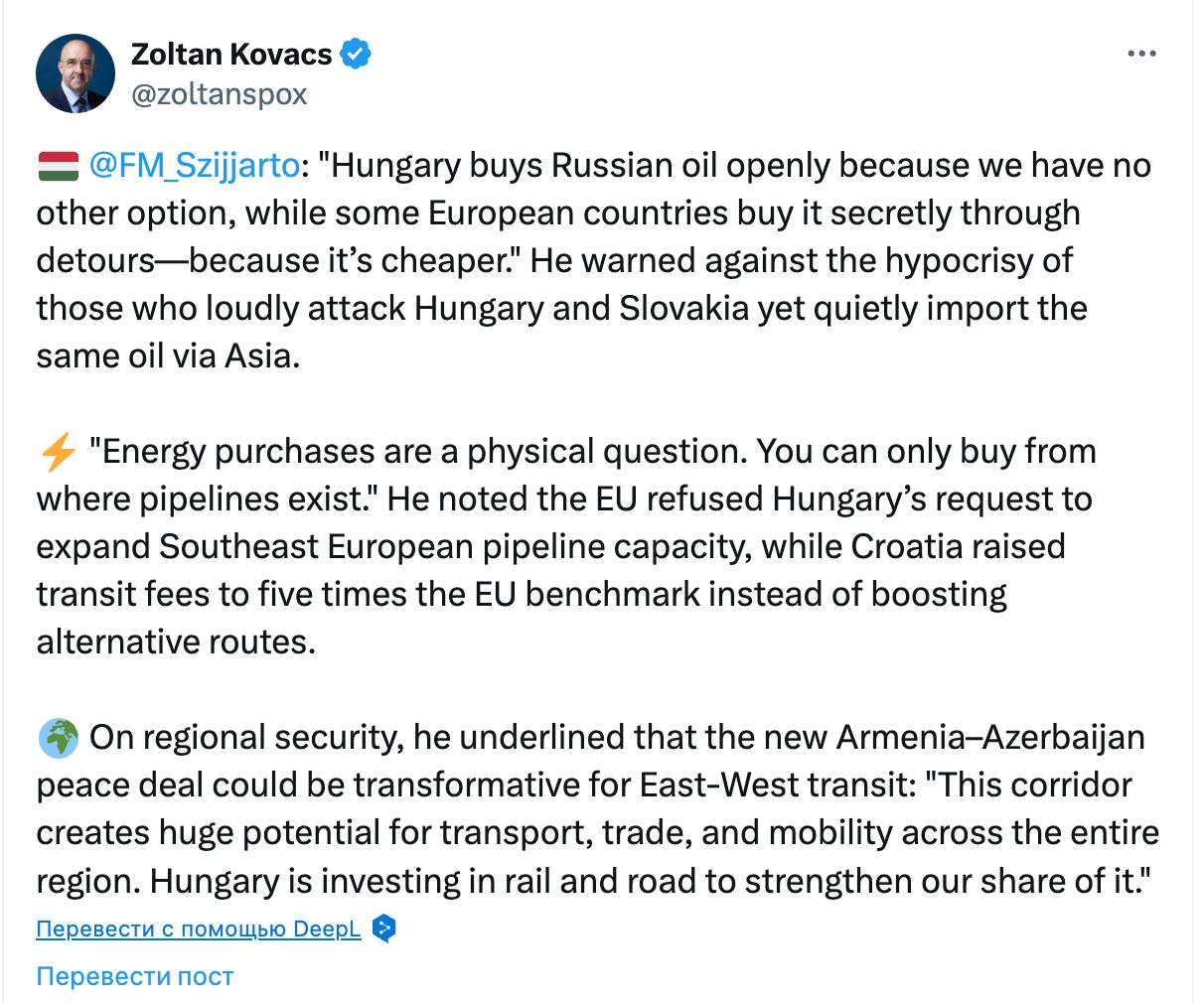 "Венгрия открыто закупает российскую нефть, потому что у нас нет другого выбора, в то время как некоторые европейские страны покупают ее тайно, используя обходные пути, потому что так дешевле", - заявил Сийярто.